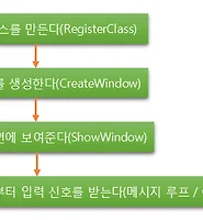 int APIENTRY WinMain(HINSTANCE hInstance, HINSTANCE hPrevInstance, LPSTR lpszCmdParam, int nCmdShow) { HWND hWnd; MSG Message; WNDCLASS WndClass; WndClass.cbClsExtra = 0; //클래스 여분 바이트수 WndClass.cbWndExtra = 0; //윈도우 여분 바이트수 WndClass.hbrBackground = (HBRUSH)GetStockObject(WHITE_BRUSH); //윈도우의 배경색 WndClass.hCursor = LoadCursor(NULL, IDC_ARROW); //프로그램에서 사용할 커서 WndClass.hIcon = LoadIcon(NULL, IDI_APPLICATION); //프로그램에서 사용할 아이콘 WndClass.hInstance = hInstance; //프로그램의 인스턴스 핸들 WndClass.lpfnWndProc = (WNDPROC)WndProc; //프로시져 함수명 WndClass.lpszClassName = lpszClass; //구조체로 만들어질 클래스명 WndClass.lpszMenuName = NULL; //프로그램에서 사용할 메뉴 WndClass.style = CS_HREDRAW | CS_VREDRAW; //윈도우 스타일 RegisterClass(&WndClass); }이런식으로 하면 된다. 마지막에 RegisterClass에게 구조체를 알려주면 등록되게 되는 것이다. 그리고 구조체로 만들어질 클래스명에 lpszClass는 LPWSTR lpszClass = L"ApiBase"; 이런식으로 전역변수로 선언하여 지정했다. 이렇게 되면
