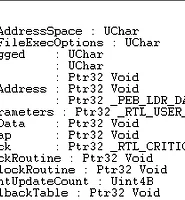 nt!_EPROCESS +0x000 Pcb : _KPROCESS +0x06c ProcessLock : _EX_PUSH_LOCK +0x070 CreateTime : _LARGE_INTEGER +0x078 ExitTime : _LARGE_INTEGER +0x080 RundownProtect : _EX_RUNDOWN_REF +0x084 UniqueProcessId : Ptr32 Void +0x088 ActiveProcessLinks : _LIST_ENTRY +0x090 QuotaUsage : [3] Uint4B +0x09c QuotaPeak : [3] Uint4B +0x0a8 CommitCharge : Uint4B +0x0ac PeakVirtualSize : Uint4B +0x0b0 VirtualSize : Uint4B +0x0b4 SessionProcessLinks : _LIST_ENTRY +0x0bc DebugPort : Ptr32 Void +0x0c0 ExceptionPort : Ptr32 Void +0x0c4 ObjectTable : Ptr32 _HANDLE_TABLE +0x0c8 Token : _EX_FAST_REF +0x0cc WorkingSetLock : _FAST_MUTEX +0x0ec WorkingSetPage : Uint4B +0x0f0 AddressCreationLock : _FAST_MUTEX +0x110 HyperSpaceLock : Uint4B +0x114 ForkInProgress : Ptr32 _ETHREAD +0x118 HardwareTrigger : Uint4B +0x11c VadRoot : Ptr32 Void +0x120 VadHint : Ptr32 Void +0x124 CloneRoot : Ptr32 Void +0x128 NumberOfPrivatePages : Uint4B +0x12c NumberOfLockedPages : Uint4B +0x130 Win32Process : Ptr32 Void +0x134 Job : Ptr32 _EJOB +0x138 SectionObject : Ptr32 Void +0x13c SectionBaseAddress : Ptr32 Void +0x140 QuotaBlock : Ptr32 _EPROCESS_QUOTA_BLOCK +0x144 WorkingSetWatch : Ptr32 _PAGEFAULT_HISTORY +0x148 Win32WindowStation : Ptr32 Void +0x14c InheritedFromUniqueProcessId : Ptr32 Void +0x150 LdtInformation : Ptr32 Void +0x154 VadFreeHint : Ptr32 Void +0x158 VdmObjects : Ptr32 Void +0x15c DeviceMap : Ptr32 Void +0x160 PhysicalVadList : _LIST_ENTRY +0x168 PageDirectoryPte : _HARDWARE_PTE +0x168 Filler : Uint8B +0x170 Session : Ptr32 Void +0x174 ImageFileName : [16] UChar +0x184 JobLinks : _LIST_ENTRY +0x18c LockedPagesList : Ptr32 Void +0x190 ThreadListHead : _LIST_ENTRY +0x198 SecurityPort : Ptr32 Void +0x19c PaeTop : Ptr32 Void +0x1a0 ActiveThreads : Uint4B +0x1a4 GrantedAccess : Uint4B +0x1a8 DefaultHardErrorProcessing : Uint4B +0x1ac LastThreadExitStatus : Int4B +0x1b0 Peb : Ptr32 _PEB +0x1b4 PrefetchTrace : _EX_FAST_REF +0x1b8 ReadOperationCount : _LARGE_INTEGER +0x1c0 WriteOperationCount : _LARGE_INTEGER +0x1c8 OtherOperationCount : _LARGE_INTEGER +0x1d0 ReadTransferCount : _LARGE_INTEGER +0x1d8 WriteTransferCount : _LARGE_INTEGER +0x1e0 OtherTransferCount : _LARGE_INTEGER +0x1e8 CommitChargeLimit : Uint4B +0x1ec CommitChargePeak : Uint4B +0x1f0 AweInfo : Ptr32 Void +0x1f4 SeAuditProcessCreationInfo : _SE_AUDIT_PROCESS_CREATION_INFO +0x1f8 Vm : _MMSUPPORT +0x238 LastFaultCount : Uint4B +0x23c ModifiedPageCount : Uint4B +0x240 NumberOfVads : Uint4B +0x244 JobStatus : Uint4B +0x248 Flags : Uint4B +0x248 CreateReported : Pos 0, 1 Bit +0x248 NoDebugInherit : Pos 1, 1 Bit +0x248 ProcessExiting : Pos 2, 1 Bit +0x248 ProcessDelete : Pos 3, 1 Bit +0x248 Wow64SplitPages : Pos 4, 1 Bit +0x248 VmDeleted : Pos 5, 1 Bit +0x248 OutswapEnabled : Pos 6, 1 Bit +0x248 Outswapped : Pos 7, 1 Bit +0x248 ForkFailed : Pos 8, 1 Bit +0x248 HasPhysicalVad : Pos 9, 1 Bit +0x248 AddressSpaceInitialized : Pos 10, 2 Bits +0x248 SetTimerResolution : Pos 12, 1 Bit +0x248 BreakOnTermination : Pos 13, 1 Bit +0x248 SessionCreationUnderway : Pos 14, 1 Bit +0x248 WriteWatch : Pos 15, 1 Bit +0x248 ProcessInSession : Pos 16, 1 Bit +0x248 OverrideAddressSpace : Pos 17, 1 Bit +0x248 HasAddressSpace : Pos 18, 1 Bit +0x248 LaunchPrefetched : Pos 19, 1 Bit +0x248 InjectInpageErrors : Pos 20, 1 Bit +0x248 VmTopDown : Pos 21, 1 Bit +0x248 Unused3 : Pos 22, 1 Bit +0x248 Unused4 : Pos 23, 1 Bit +0x248 VdmAllowed : Pos 24, 1 Bit +0x248 Unused : Pos 25, 5 Bits +0x248 Unused1 : Pos 30, 1 Bit +0x248 Unused2 : Pos 31, 1 Bit +0x24c ExitStatus : Int4B +0x250 NextPageColor : Uint2B +0x252 SubSystemMinorVersion : UChar +0x253 SubSystemMajorVersion : UChar +0x252 SubSystemVersion : Uint2B +0x254 PriorityClass : UChar +0x255 WorkingSetAcquiredUnsafe : UChar +0x258 Cookie : Uint4B-windows xp KPROCESS구조