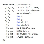 -클래스를 생성했다고 윈도우가 만들어지는 것이 아니다. 두번째 단계인 윈도우 객체를 생성해야된다.생성에 이용하는 함수는 CreateWindow라는 함수이다. LPWSTR lpszClass = L"ApiBase"; int APIENTRY WinMain(HINSTANCE hInstance, HINSTANCE hPrevInstance, LPSTR lpszCmdParam, int nCmdShow) { HWND hWnd; MSG Message; WNDCLASS WndClass; WndClass.cbClsExtra = 0;//클래스 여분 바이트수 WndClass.cbWndExtra = 0;//윈도우 여분 바이트수 WndClass.hbrBackground = (HBRUSH)GetStockObject(WHITE_BRU..