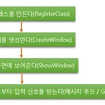 -WinMain의 마지막 메시지 루프돌리기 입니다. 윈도우를 나타내는 것까지는 다 완성했습니다. 그 다음 이젠 윈도우에 명령이 들어왔을 때 처리해주는 부분을 완성 시켜야 됩니다. 그 부분이 WndProc윈도우 프로시져 부분입니다. 1.이벤트 처리 방식 : 임의의 이벤트가 발생하면 즉시 처리되는 방식이며 이벤트는 키보드나 마우스의 입력을 말합니다. 메세지 내용 1) 이벤트가 발생한 윈도우 핸들 2) 이벤트의 종류 3)이벤트가 접수된 시간 4) 이벤트가 발생한 위치(좌표)위와 같은 메시지가 들어오게 되면 윈도우는 다음의 내용을 처리하게 됩니다. 2.메시지 루프 일단 메세지를 받으면 윈도우 프로시저로 보내줘야되는데 이때 메시지 루프가 그 역할을 하게 됩니다. [그림 1 이벤트 발생시 처리 과정] 1)어떤 이벤..