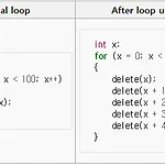 https://en.wikipedia.org/wiki/Loop_unrolling 간단한 예다..어셈코드를 생각해보면 왼쪽같은 경우비교+증가=>함수 이게 100번이 반복된다그에 비해 오른쪽은비교+5씩증가=>5회 함수 이게 20번이다.뭐 똑같다고 생각하겠지만 어셈코드로 생각해보면왼쪽은 비교 증가 함수 이게 계속해서 반복되지만오른쪽은 비교 증가 함수 함수 함수 함수 함수 이다.즉 4번의 비교 증가가 줄어 코드가 그만큼 간소화된다.